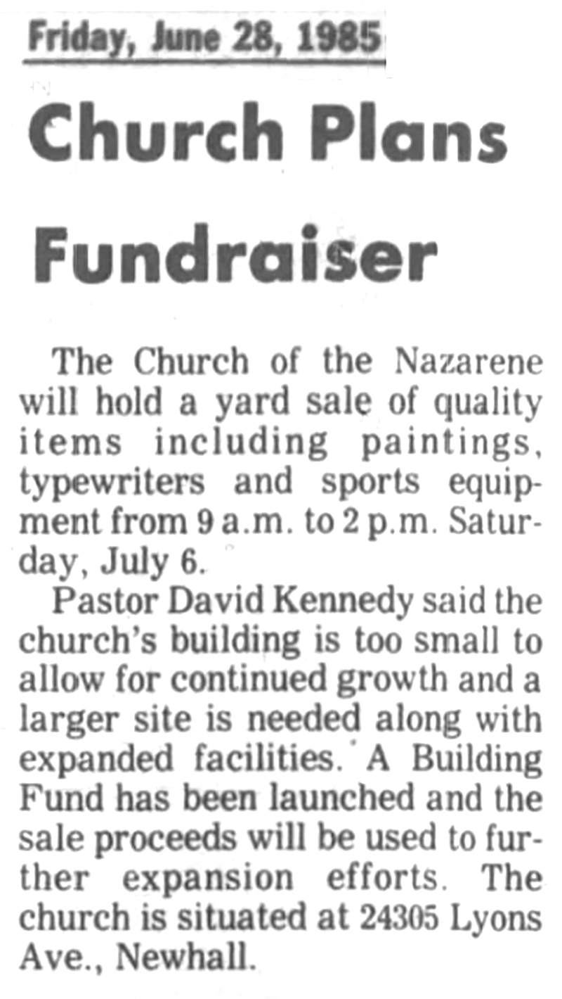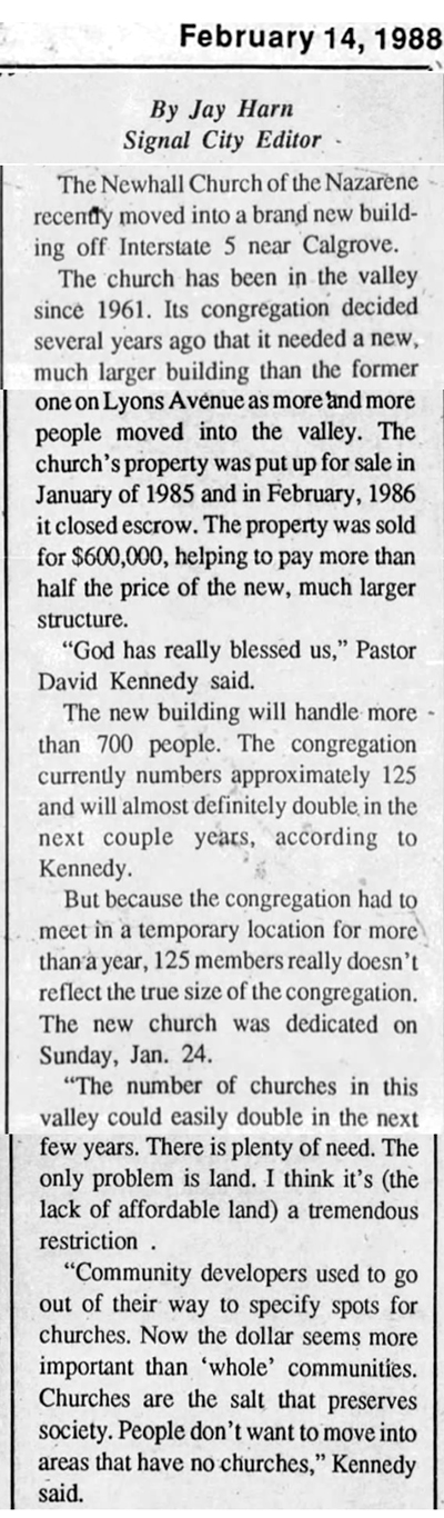 The church has been in the valley since 1961. Its congregation decided several years ago that it needed a new, much larger building than the former one on Lyons Avenue as more and more people moved into the valley. The church's property was put up for sale in January of 1985, and in February 1986 it closed escrow. The property was sold for $600,000, helping to pay more than half the price of the new, much larger structure.