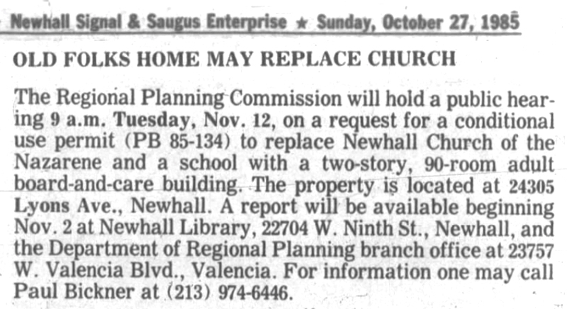 The Regional Planning Commission will hold a public hearing 9 a.m. Tuesday, Nov. 12, on a request for a conditional use permit (PB 85-134) to replace Newhall Church of the Nazarene and a school with a two-story, 90-room adult board-and-care building. The property is located at 24305 Lyons Ave., Newhall. A report will be available beginning Nov. 2 at Newhall Library, 22704 W. Ninth St., Newhall, and the Department of Regional Planning branch office at 23757 W. Valencia Blvd., Valencia. For information one may call Paul Bickner at (213) 974-6446.