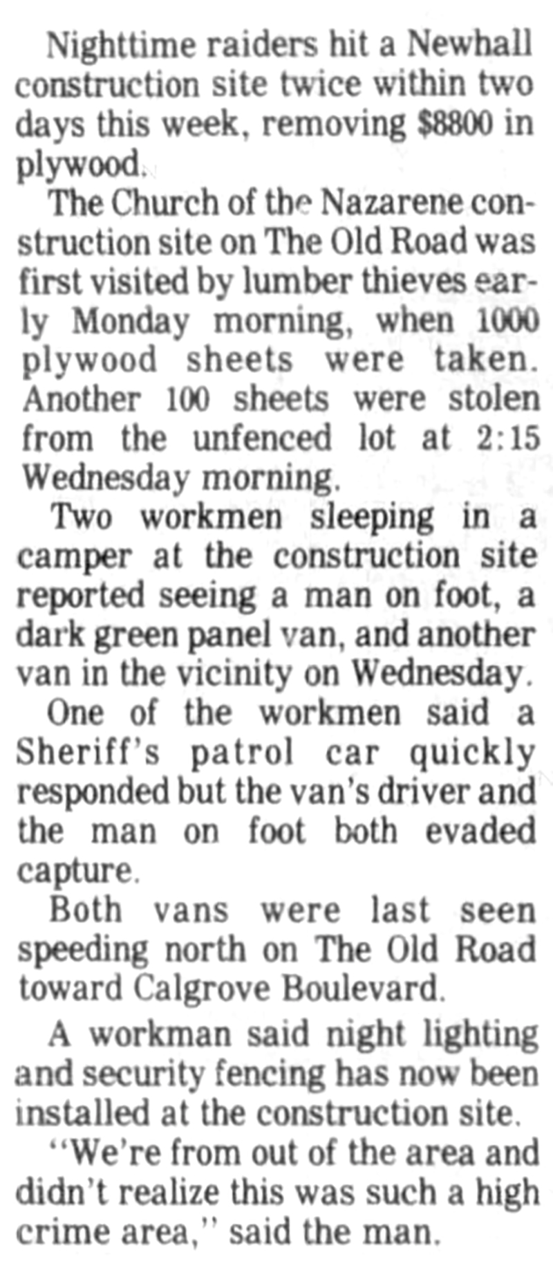 The Church of the Nazarene construction site on The Old Road was first visited by lumber thieves early Monday morning, when 1,000 plywood sheets were taken. Another 100 sheets were stolen from the unfenced lot at 2:15 Wednesday morning.