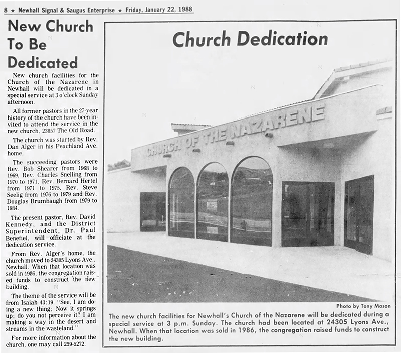 Newhall Church of the Nazarene (NewNaz) began in the Santa Clarita Valley in a retired pastor's home on Peachland Ave. in 1957. Several years later in 1961, Rev. Dan Alger was called to lead the congregation and the church was incorporated. The property on Lyons Ave. was purchased and the church building was built.