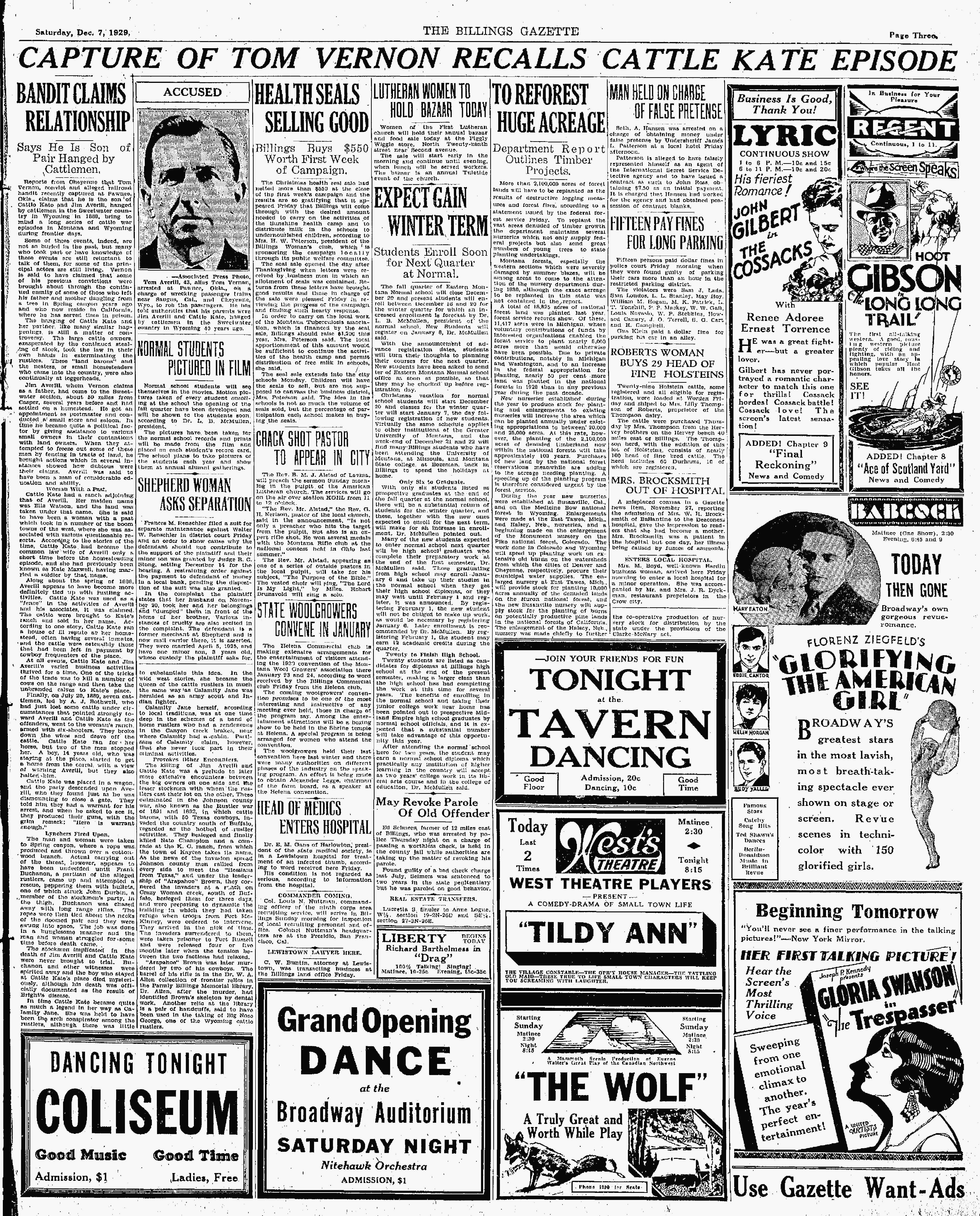 Reports from Cheyenne that Tom Vernon, convict and alleged railroad bandit recently captured at Pawnee, Okla., claims that he is the son of Cattle Kate and Jim Averill, hanged by cattlemen in the Sweetwater country in Wyoming in 1889, bring to mind a long series of cattle war episodes form Montana and Wyoming during frontier days.