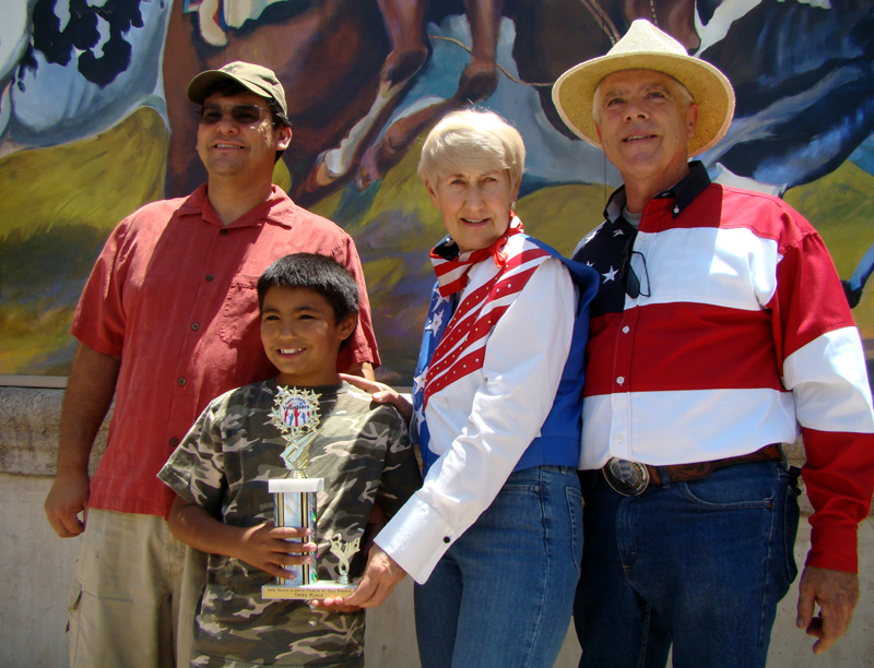 Representatives of Cub Scout Pack 575 collect their trophy from parade judging co-chairs Laurene Weste and James McCarthy.