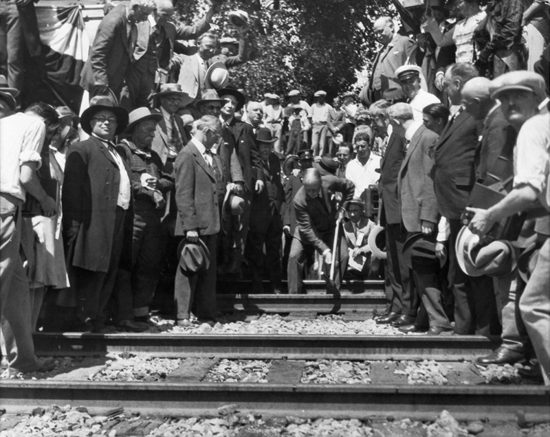 Sept. 5, 1926 — San Francisco banker William H. Crocker, son of the late Southern Pacific Railroad President Charles Crocker, hammers the ceremonial golden spike at the 1926 reenactment.