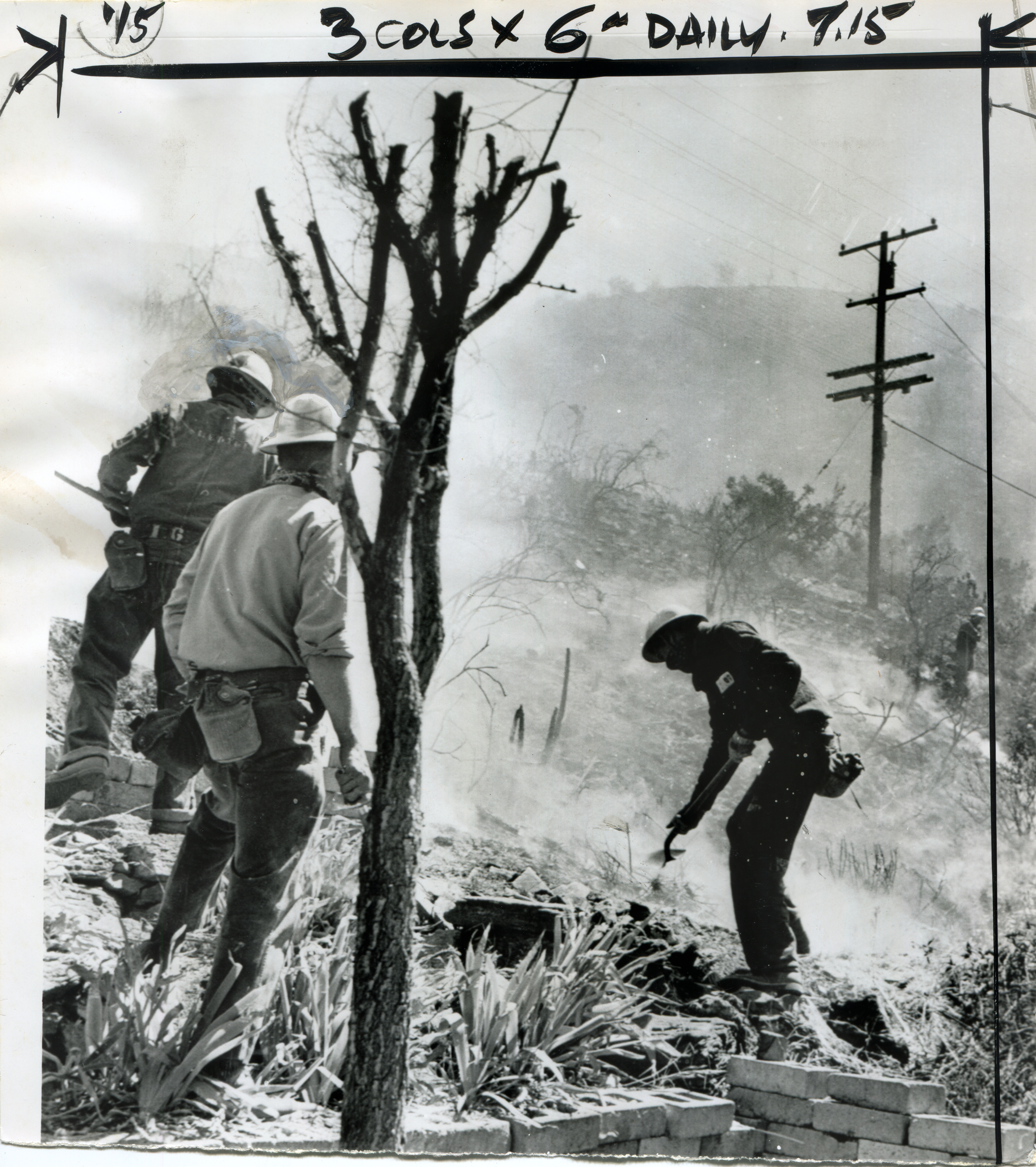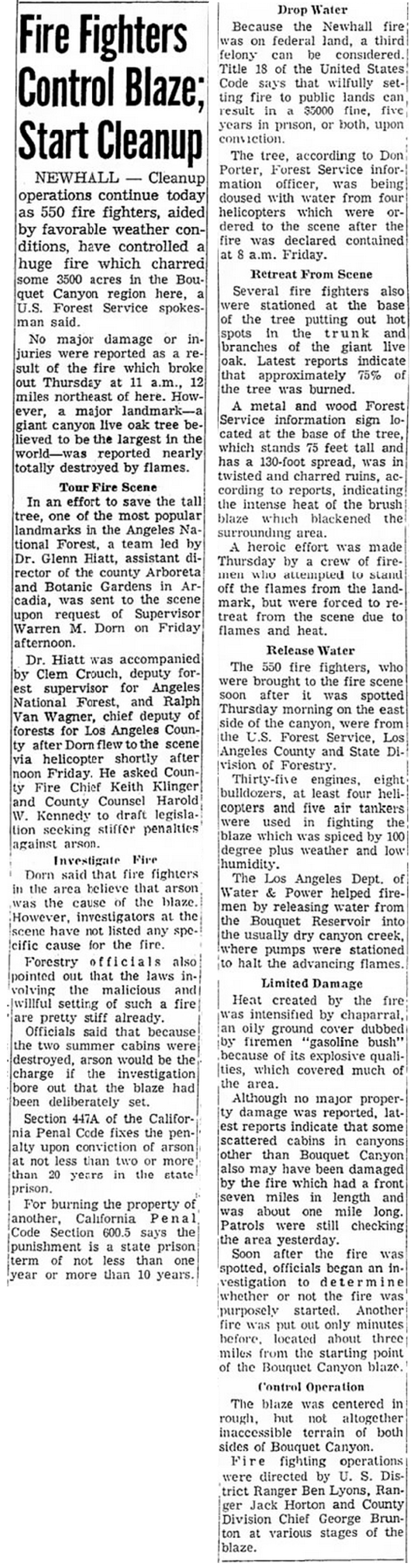 Dr. Hiatt was accompanied by Clem Crouch, deputy forest supervisor for Angeles National Forest, and Ralph Van Wagner, chief deputy of forests for Los Angeles County after Dorn flew to the scene via helicopter shortly after noon Friday. He asked County Fire Chief Keith Klinger and County Counsel Harold W. Kennedy to draft legislation seeking stiffer penalties against arson.