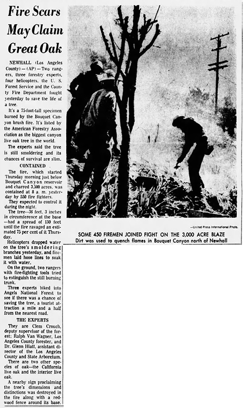 In an effort to save the tall tree, one of the most popular landmarks in the Angeles National Forest, a team led by Dr. Glenn Hiatt, assistant director of the county Arboreta and Botanic Gardens in Arcadia, was sent to the scene upon request of Supervisor Warren M. Dorn on Friday afternoon.