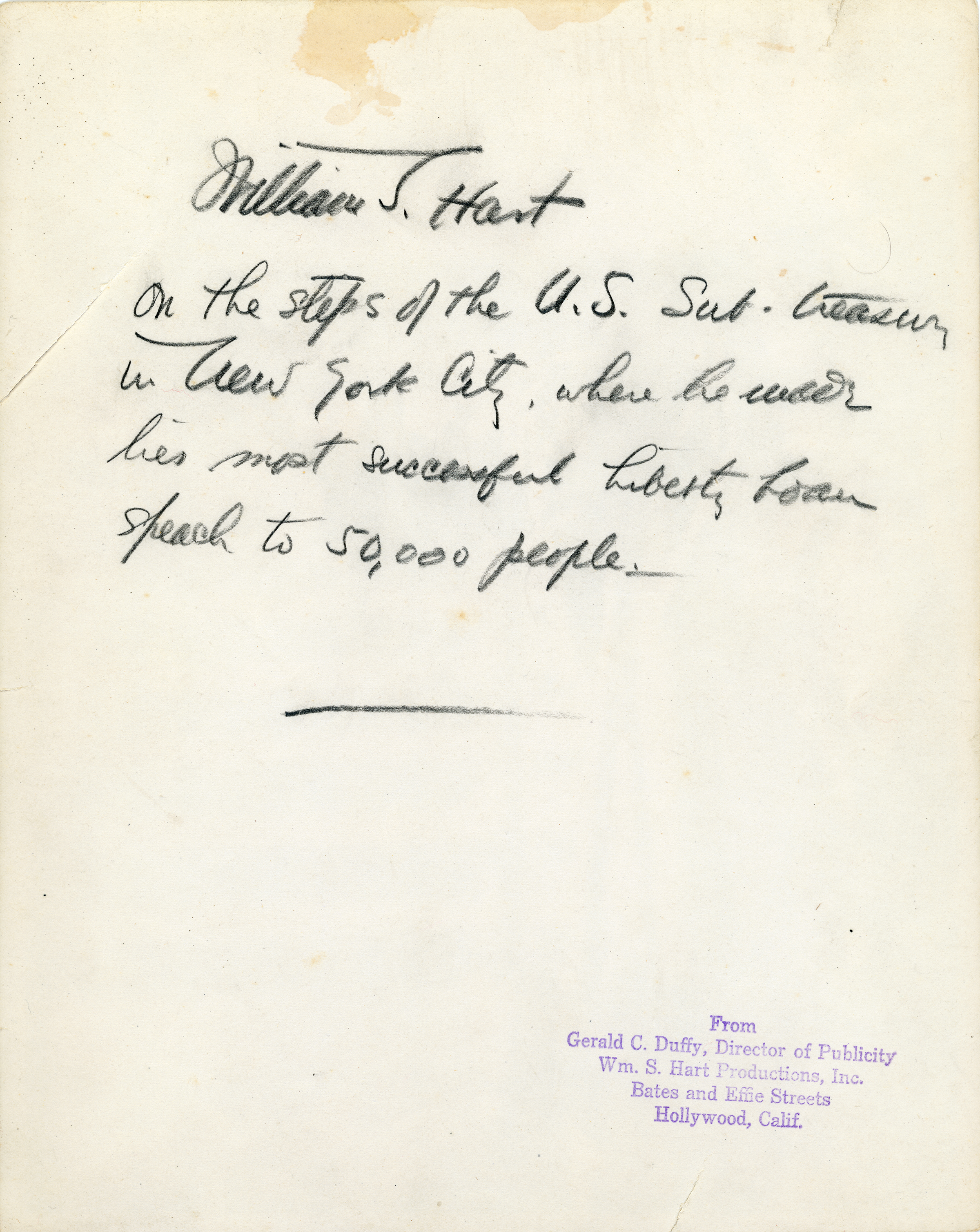 The print is also stamped on the back: "From Gerald C. Duffy, Director of Publicity, William S. Hart Productions Inc., Bates and Effie Streets, Hollywood, Calif." Bond rallies were held daily, and Hart's appearance was eagerly anticipated. The New York Sun reported beforehand (October 3, 1918):