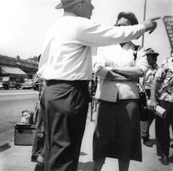 Director Lewis Allen gives instructions to female lead Nancy Gates outside the M&N Market